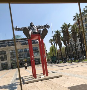 Leaving the station, we decided to head into Perpignan for a coffee and croissant and as we wandered into the city centre (about 15 minutes walk) we walked past the statue of Dali ‘en Levitation’. He is seated on a high red chair, outside FNAC, on the Place de Catalogne and facing towards the train station. The FNAC shop is located inside the original ‘Dames de France’ building which was opened in 1910.