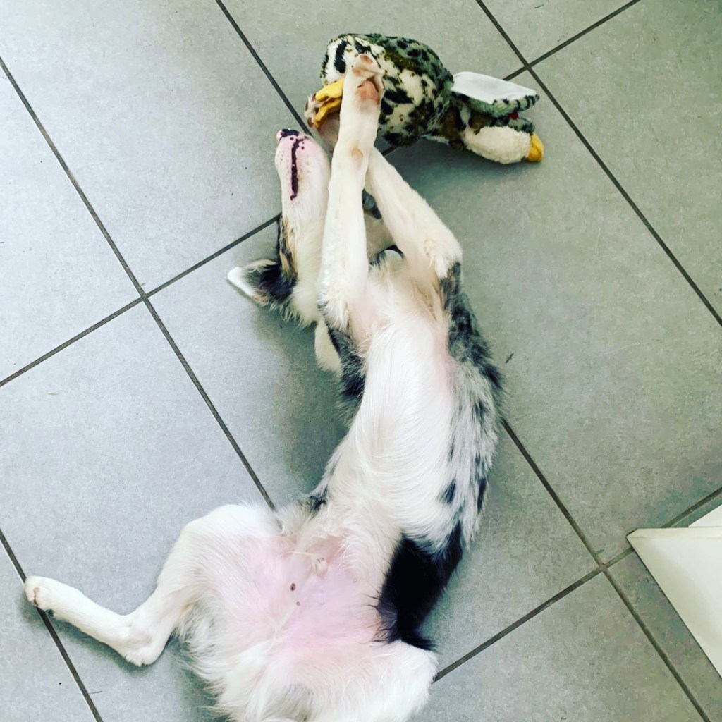 Finally, here are a few of his latest photos in which you can see him playing with a new, squeaky duck toy, having a snooze with his bed and enjoying a Sunday stretch!