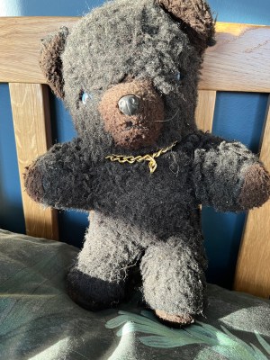 As a child, I remember having several soft toys that I loved. I still have one remaining teddy bear. He is unusual as he has black fur and blue eyes. I don’t remember his name but it might have been ‘Bruno’.