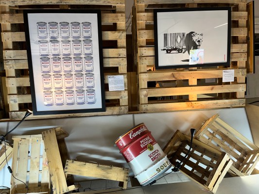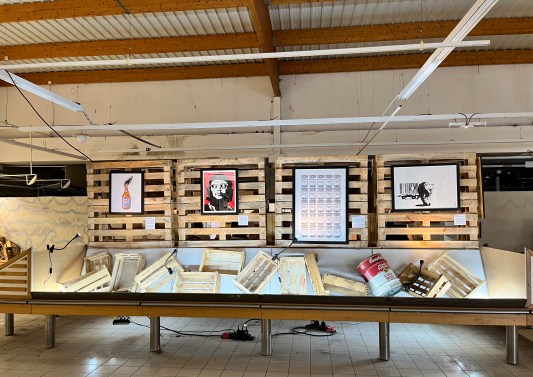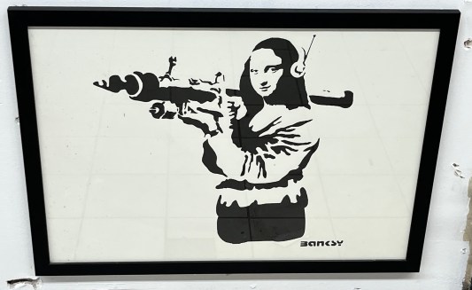 I have long been a fan of Banksy’s work, so I was delighted to discover that there would be an exhibition of his art in Villefranche de Lauragais, a twenty-five minute drive from us, in the direction of Toulouse. The exhibition was held in a former supermarket with works displayed on pallets. I thought this was the ideal setting for a Banksy exhibition.