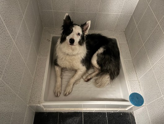 Our weather was typically autumnal, with plenty of sunshine, pleasant temperatures and occasional storms. Zeph is terrified of thunder and decided that the shower was the safest place to be.
